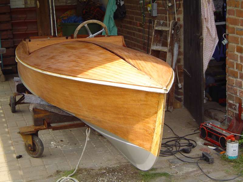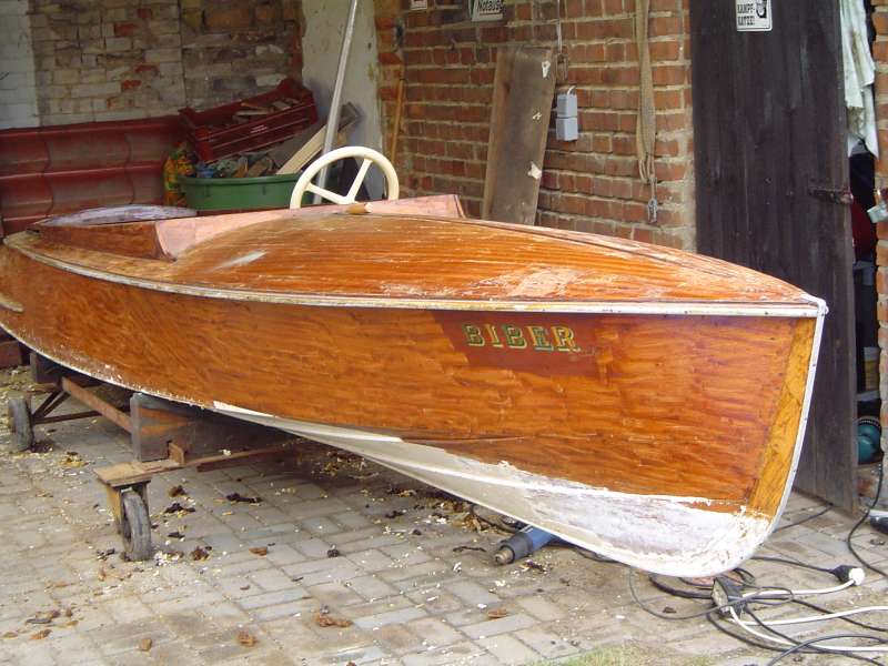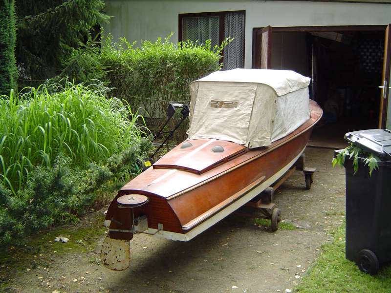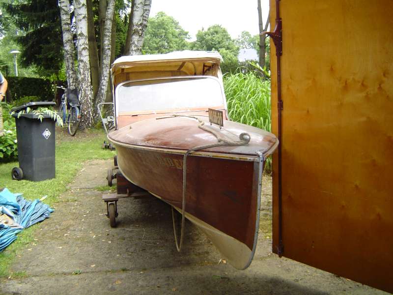 Seit Februar 2002 sind wir von einem seltenen Virus befallen. Dem Holzbootvirus. Nicht einmal im Besitz eines Führerscheines, kamen wir im Februar 2002 rein zufällig zu einem schon geringfügig angeschliffenen Filius mehr... Dem Vorbesitzer ging schon nach 5 Stunden schleifen die „Puste" aus. Pech für ihn - Glück für uns. Vor uns lagen mehrere Monate Arbeit. Schleifen, ölen, lackieren, schrauben, basteln, improvisieren. Erster Wasserkontakt Pfingsten 2002. Die „Jungfernfahrt“ endete nach 20 min. Fahrzeit mit einem rettenden Speed ans Ufer. Das Boot war vollgelaufen und drohte auf dem See abzusaufen. Holzbootfreaks werden nun den Kopf schütteln. Ja, wir haben es nicht vorquellen lassen. Diesen Zeilen kann der Leser entnehmen, wir waren Laien durch und durch. Die Saisons 2003 und 2004 verliefen ohne weitere Zwischenfälle. Irgendwann schwärmten wir in einem größeren Kreis über Backdecker. Backdecker haben doch eine ganz tolle Form… Im Juli 2005 kam ein guter Bekannter und erzählte uns, dass er bei einem älteren Herrn in der Garage ein Boot gesehen habe. Er berichtete uns von einem sehr schmalen und langen Boot. Der erste Gedanke, ein Backdecker. Wir besichtigten das Boot und mussten feststellen, es war kein Backdecker. Der ältere Herr war Zweitbesitzer und kaufte Anfang der 60iger Jahre dieses Boot und fuhr es die letzte Saison 1990. Auf Nachfrage, was es denn für ein Bootstyp sei, meinte er, er habe gehört, es sei ein Schönherr-Boot. Mehr wusste er nicht. Wir wurden uns handelseinig und nahmen das Boot mit. Der Zustand war erstaunlich gut, aber um eine Restaurierung kamen wir nicht herum.