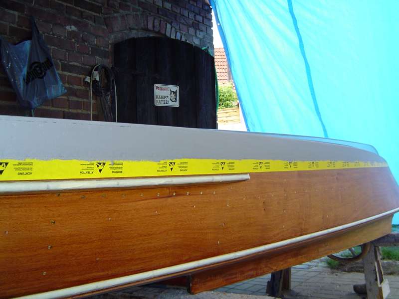 Mit Holzschutzmittel Intertox der Firma International wurde es 4 x vollständig gestrichen. Das Unterwasserschiff wurde mit Primer 2 x und danach 1 x mit Anitfouling gerollt.