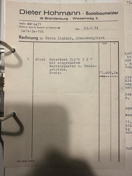 Für 17466,20 Mark kaufte 1974 der erste Eigner diese Hohmann H3S. Angetrieben vom Wartburg 353 mit 50 PS und Wendegetriebe bietet es Platz für 4 Personen. Das Boot ist im originalen Zustand erhalten.