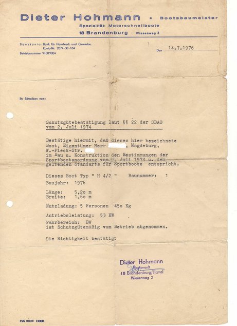 Gebaut wurde das hier vorgestellte Boot 1976 auf der Hohmann Werft in Brandenburg. Das hier gezeigte Boot ist im Besitz von unseres Vereinsmitgliedes Kai der es aus dem Erstbesitz der Auftraggeberin gekauft und restauriert hat. Das Boot hat damals 18.000 Ost Markt gekostet wie dem originalen Kaufvertrag zu entnehmen ist.