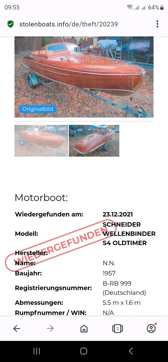 Diese Schneider hat eine bewegte Geschichte hinter sich. Im April 2014 wurde das Boot in Berlin als gestohlen gemeldet. Erst 2021 tauchte es in Berlin wieder auf, ohne dass in der Zwischenzeit Veränderungen daran vorgenommen wurden. Da das Boot vollkaskoversichert war, wurde ein Versicherungsdetektiv darauf aufmerksam. Wie uns mitgeteilt wurde, konnte der Verbleib des Bootes zwischen 2014 und 2021 nicht geklärt werden, und das Diebstahlverfahren wurde eingestellt. Schließlich gab die Versicherung das Boot frei, und heute befindet es sich im Besitz eines Sammlers aus den Niederlanden.