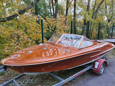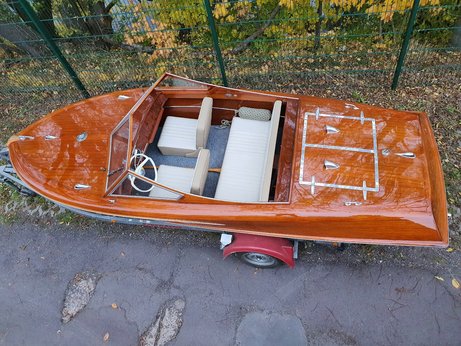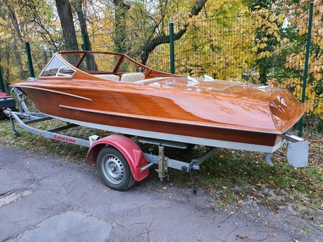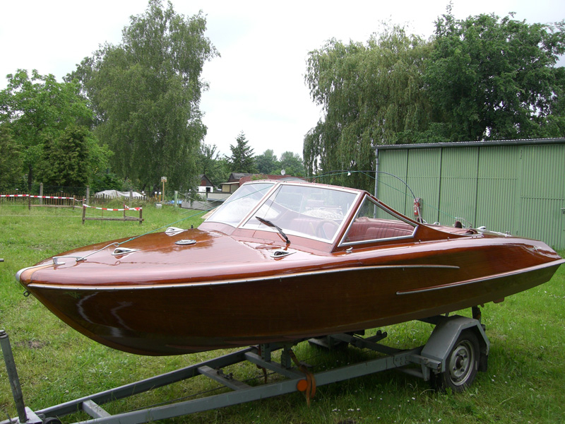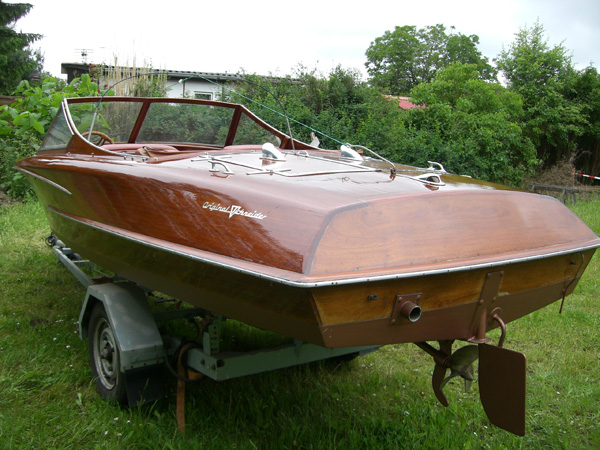 Hier sehen wir das Einzelstück der SL 2 mit Mittelmotor, das 2023 bei Kleinanzeigen auftauchte und seinen Weg in die Oldieboot-Gemeinde fand. Wolfgang Schneider bestätigte, dass das Boot original ist und auf Kundenwunsch so gebaut wurde.