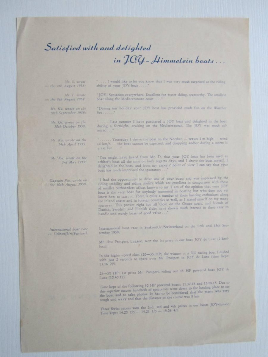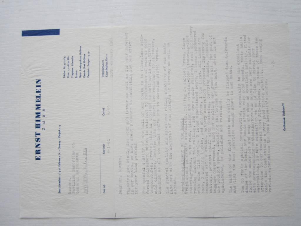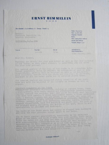 Ernst Himmelein war ein Pionier im deutschen Wassersportmarkt und betrieb sein Unternehmen in Heilbronn. Er spezialisierte sich auf den Vertrieb von Motoren renommierter Marken wie Apache, Johnson, Evinrude, Mercury sowie auf Segelboote, Motorboote und Wassersportartikel. Darüber hinaus erkannte Himmelein das Potenzial von kleinen Motorbooten aus glasfaserverstärktem Kunststoff (GFK) und entwickelte seine eigene innovative Bootsserie.