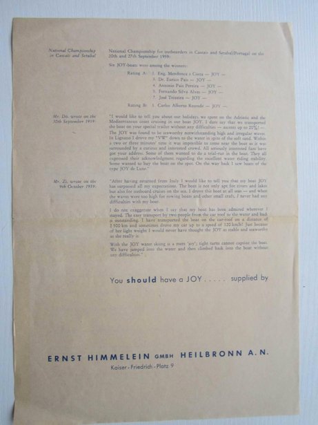 Seine Boote nahmen erfolgreich an internationalen Wettkämpfen teil, wie beispielsweise beim National Championship für Außenborder am 20. September 1959 in Cascais und am 27. September 1959 in Setúbal, bei dem die Joy-Junior-Boote beeindruckende Platzierungen erreichten.