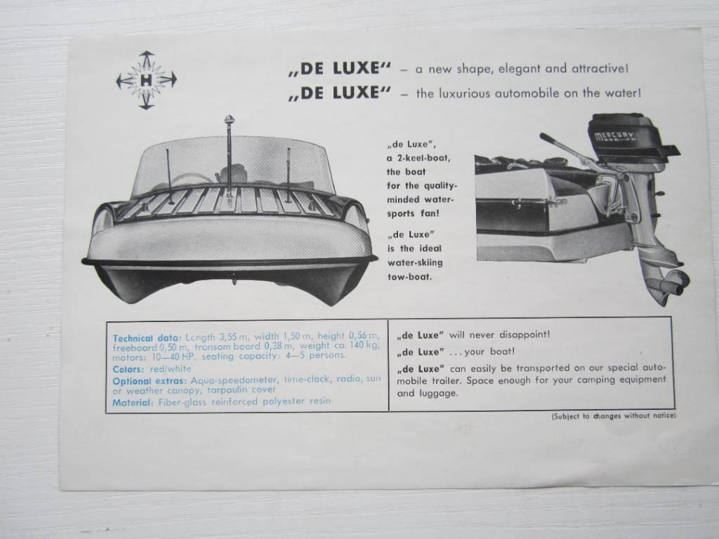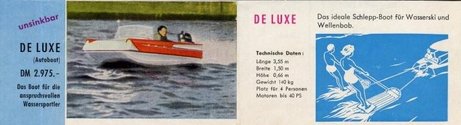 Mit einem Gewicht von 140 kg und einer Motorisierungsmöglichkeit von bis zu 40 PS ist die De Luxe ein vollwertiges Motorboot, das Platz für vier Personen bietet. Dieses Modell wurde für 2.975 DM angeboten und richtete sich an anspruchsvolle Wassersportler, die sowohl Wert auf Leistung als auch auf stilvolles Design legten.
