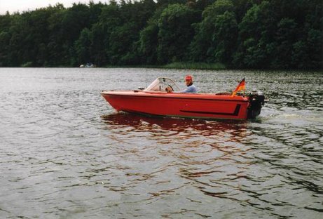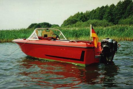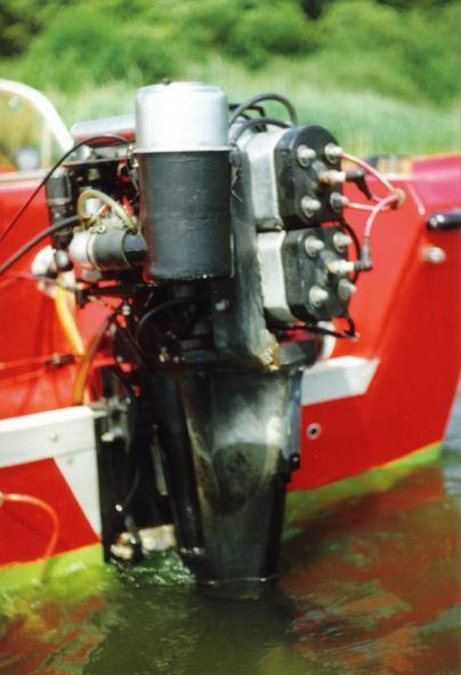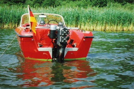es ist wirklich ein Trabantmotor. Auf den S/W-Fotos ist ein Vorgängermodell mit 26 PS. Der andere ist ein getunter (nach Sachsenring-Anleitung) mit ca. 35 PS. Die Zylinder und Köpfe sind Alu-ummantelt. Der Auspuff ist auch aus Alu und wassergekühlt. Die Schwungscheibe ist oben und Eigenbau. Die Steuerscheiben sind auch geändert. Der 12 Volt-Anlasser ist vom Wartburg, weil er andersherum drehen muss. Die Lima 12 V war vom Trabbi. Das Unterwasserteil ist vom 30er Wichr. Die Schraube ist aus Bronze, 340er Abguss vom König (auch Eigenbau). Einen Umbau auf Nabenauspuff habe ich auch noch dazu. Noch ein paar techn. Daten: 600 m3, ca. 35 PS, bis 5800 U/min, Gewicht 69 kg, 48 km/h. Es war auch Wasserski möglich. Übrigens hatte ich dazu eine damalige Zulassung, was die WSP ständig kontrollieren musste.